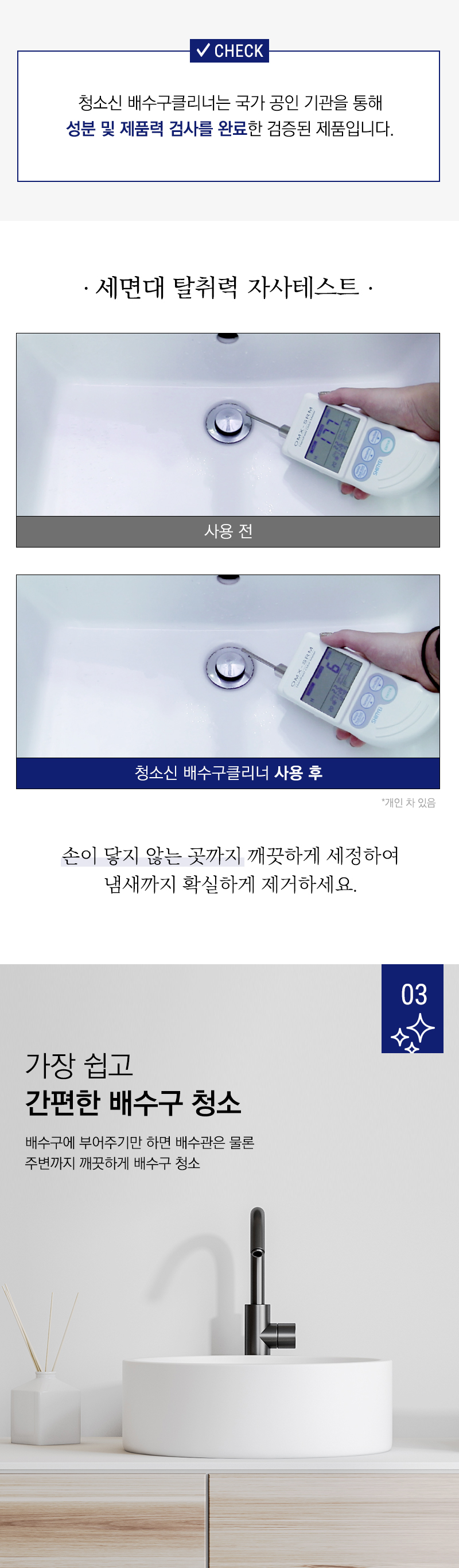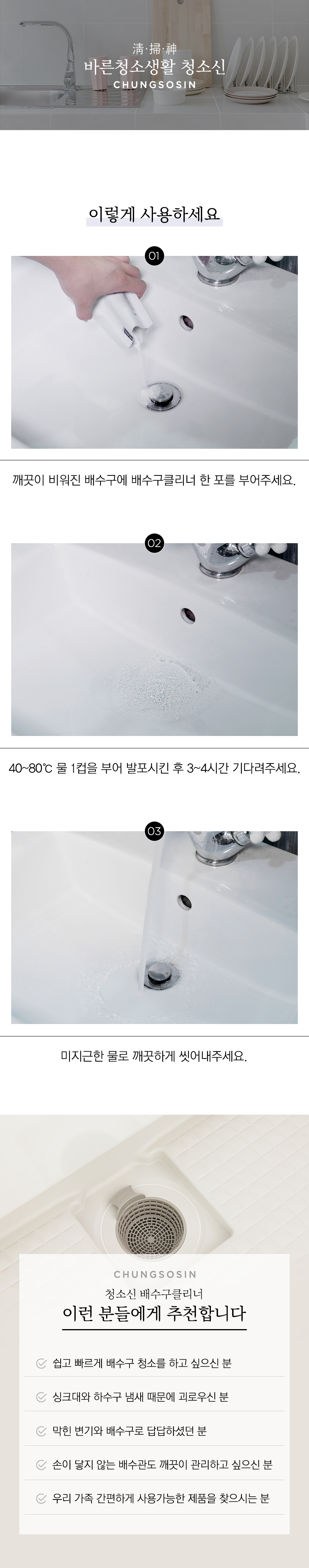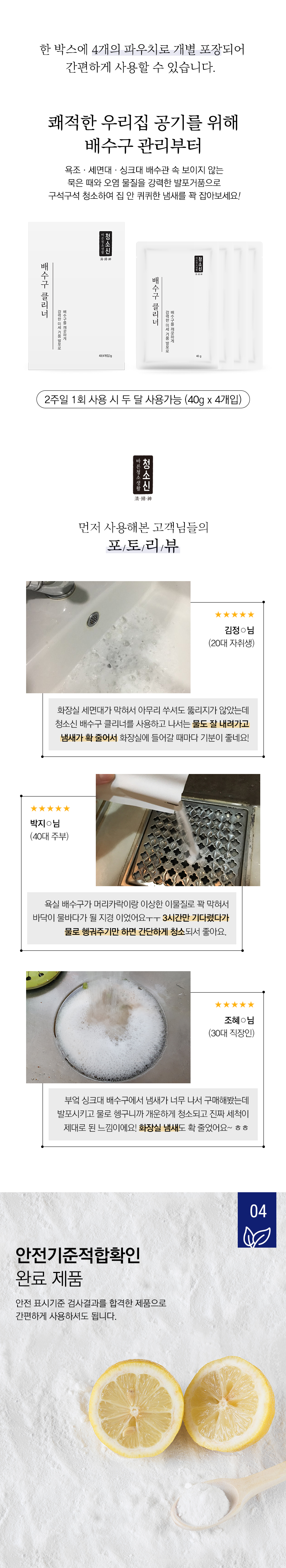 사용후기00000 구매하기 구매수량 옵션 선택 [BEST] 청소신 배수구클리너(3+1행사) (66%할인) 청소신 배수구클리너(1+1행사) (56%할인) 청소신 배수구클리너 단품 총 상품 금액 0 원 장바구니 바로 구매
